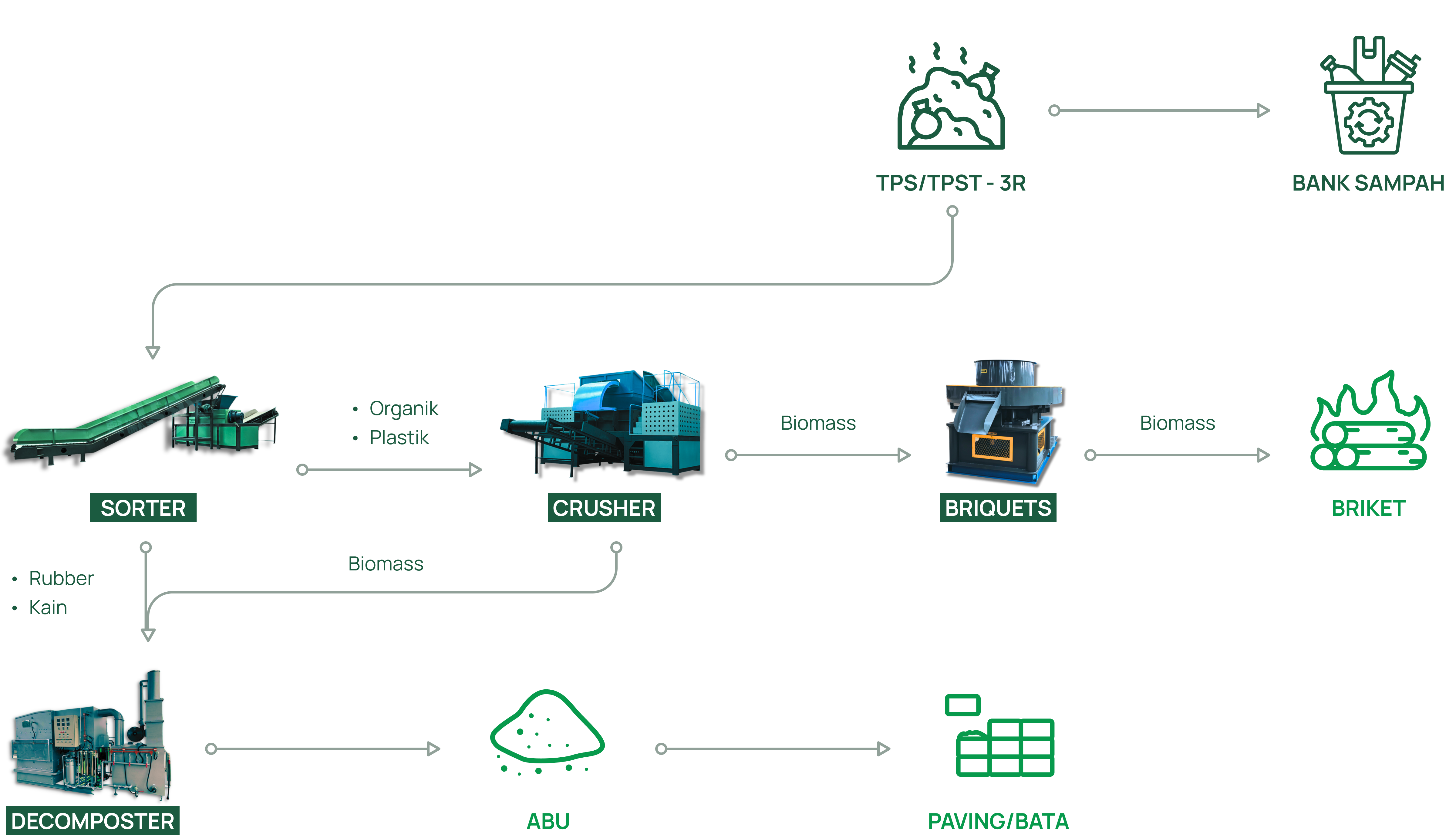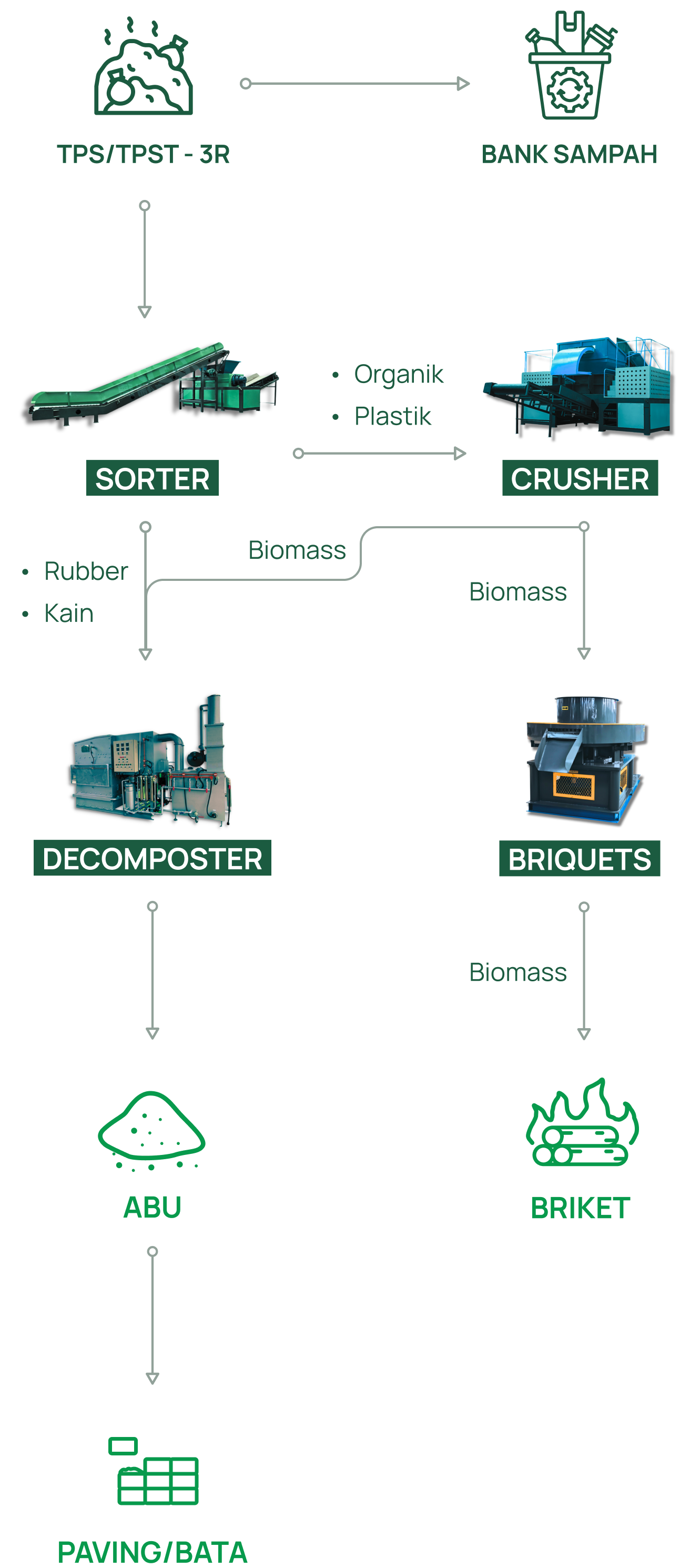 Teknologi yang ramah lingkungan untuk reduksi, pemakaian ulang, dan daur ulang sampah, melalui sistem Plasma Pyrolisis, pemilahan, produksi briket dan produksi biomassa.